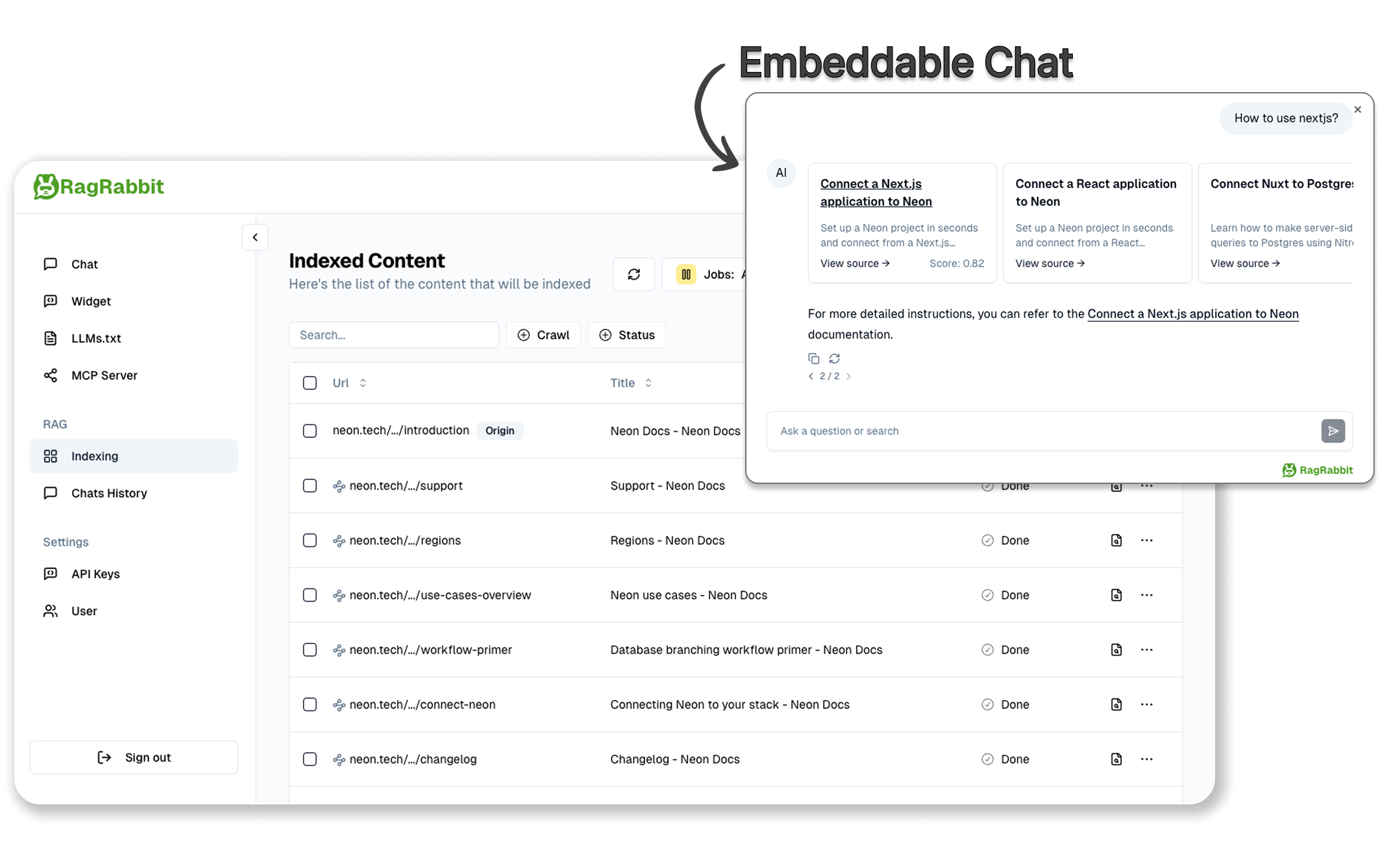 Deploy RagRabbit instantly on Vercel with zero configuration. Everything you need is included: OpenAI-powered agent, PostgreSQL with pgVector on Neon, and optional Trigger.dev for scheduled indexing.